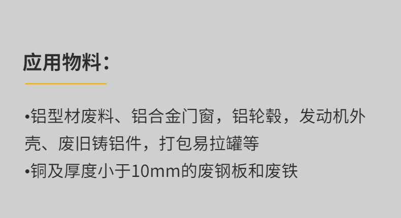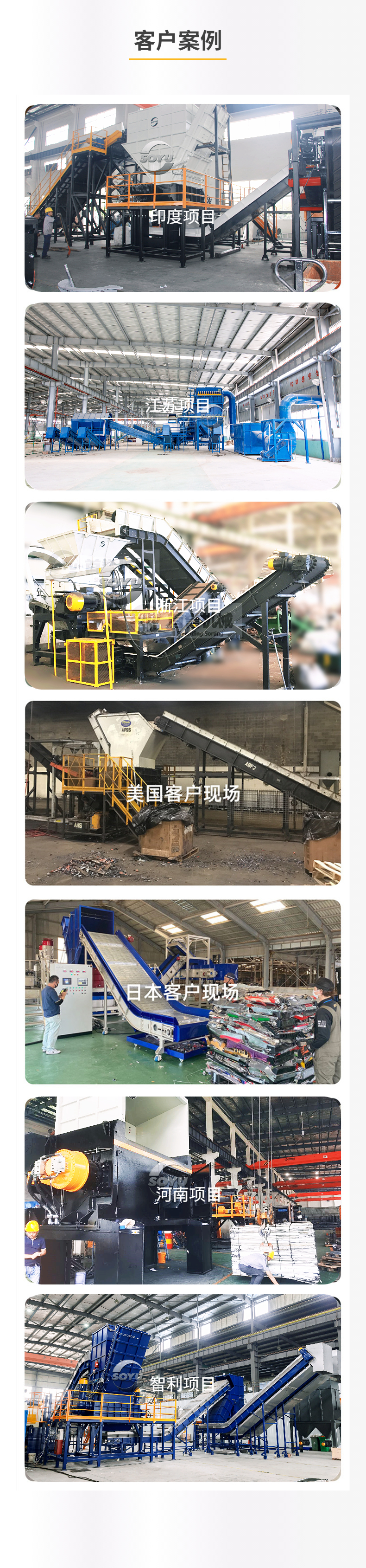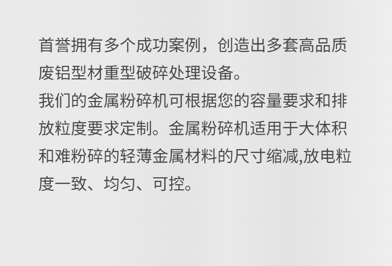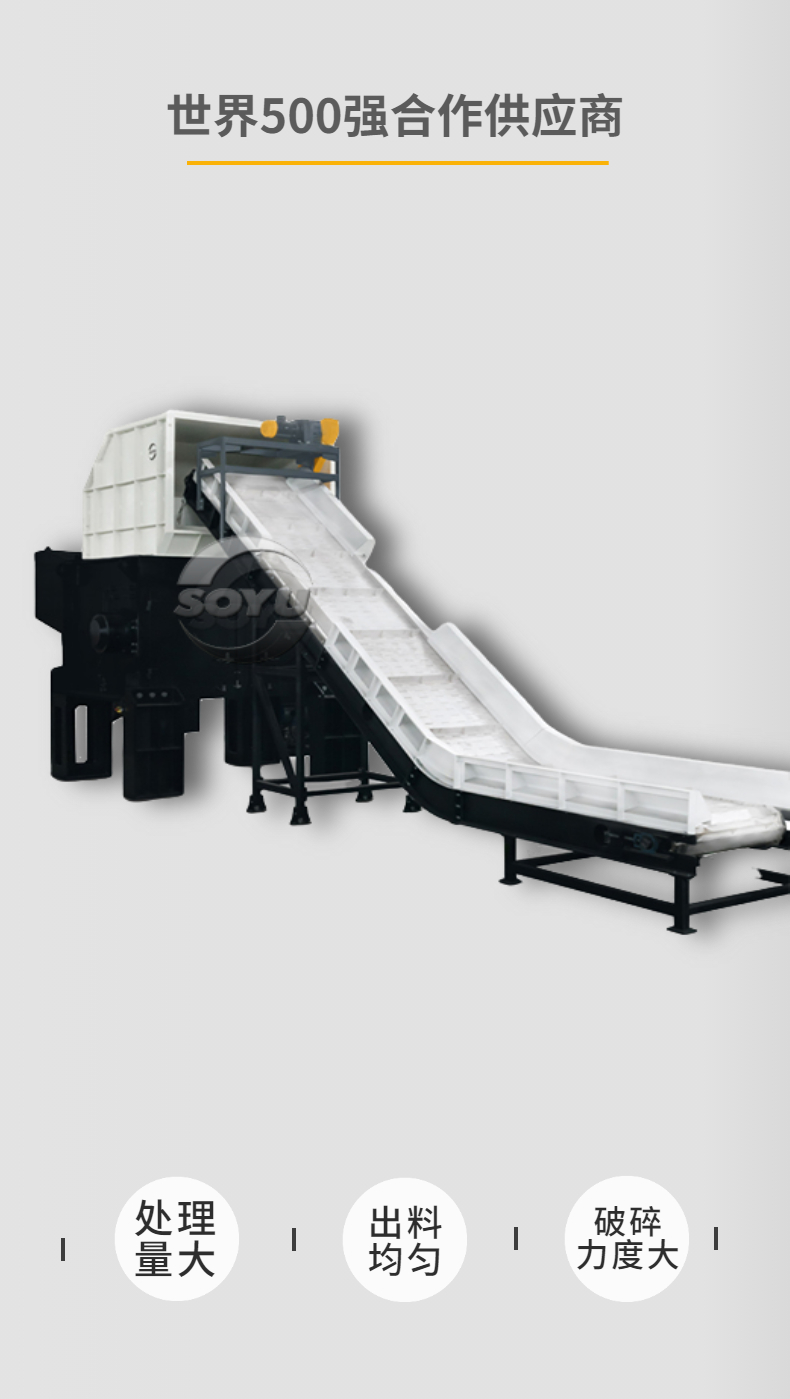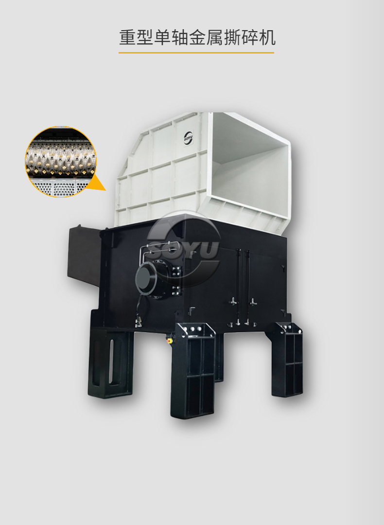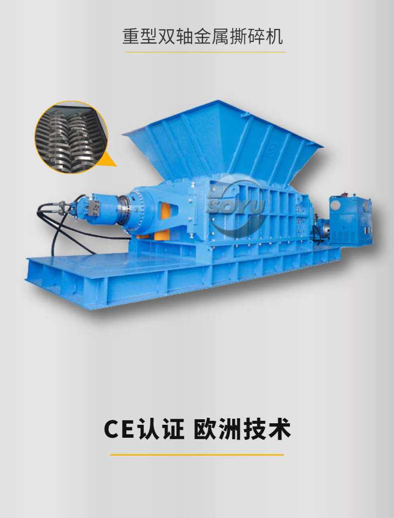 本机采用行星齿轮减速机驱动,刀片采用高强度合金钢制成,有较强的耐磨性和较高的强度等特点,轴之间差速运转,有撕扯、挤压、咬合等功能。电气部分采用西门子电气元件编程控制,具有自动检测过载保护等功能。专为破碎各种铝型材及轻薄金属物料设计,适合各种大体积,难破碎的压块的或散件的铝型材物料细化,具有出料均匀、大小可控等优点,适合撕碎的物料有:打包铝、铝泊、铝材、铝条、轻薄钢料、轻薄铁料等各种废金属物料。效率高、低转速、大转矩、低噪音