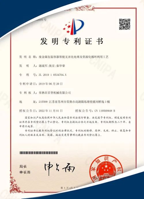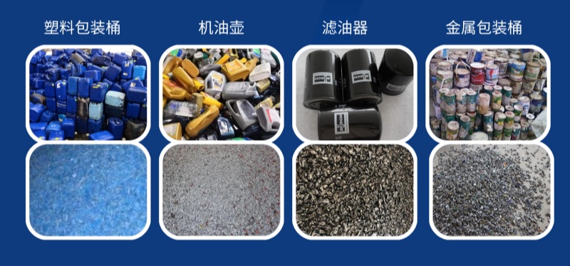 包装容器无害化资源循环利用工艺专利证书危废包装容器资源化处理系统:针对(机油滤芯、化工桶、涂料桶,机油壶、金属包装容器、塑料包装容器)等危废物料,首誉提供专用的危废包装容器资源化处理系统,集撕碎、破碎、分离、除渣、分选、清洗等功能于一体,产量达到800-5000KG/H,安全性高,抗冲击力强。刀片采用高强度合金钢制成,拥有良好的耐磨性和强度。