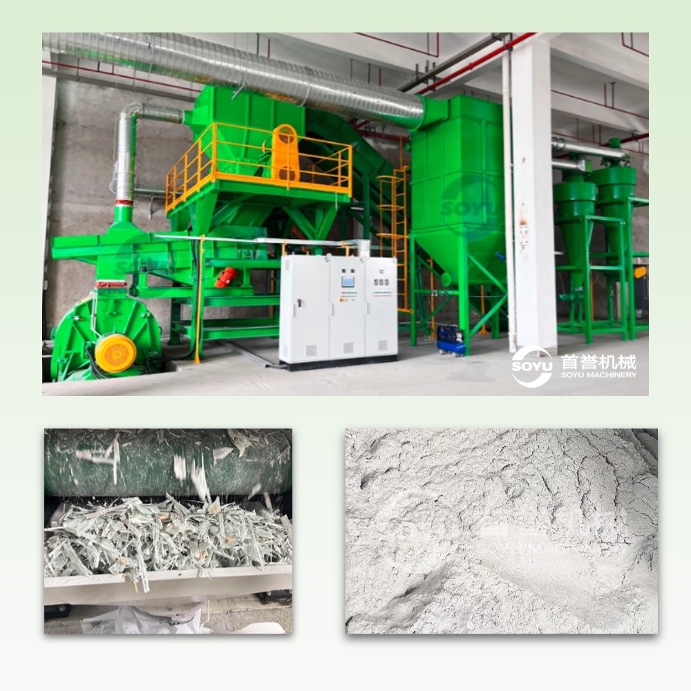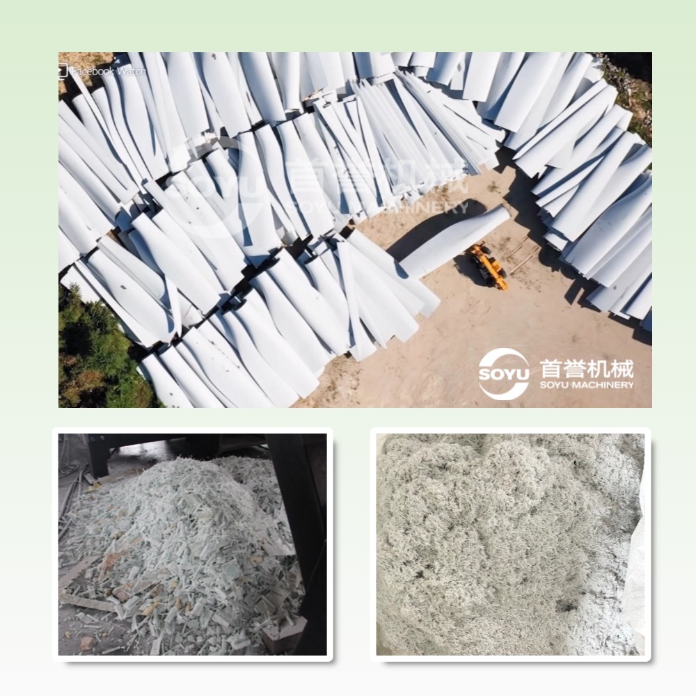 三、技术突破:智能化与精细化并行 1. 设备升级 -首誉机械研发的退役风电叶片玻璃钢制品资源化处置系统等新型装备,通过增加破碎维度,将出料粒度控制在 200目 以内,满足高端复合材料再生需求。