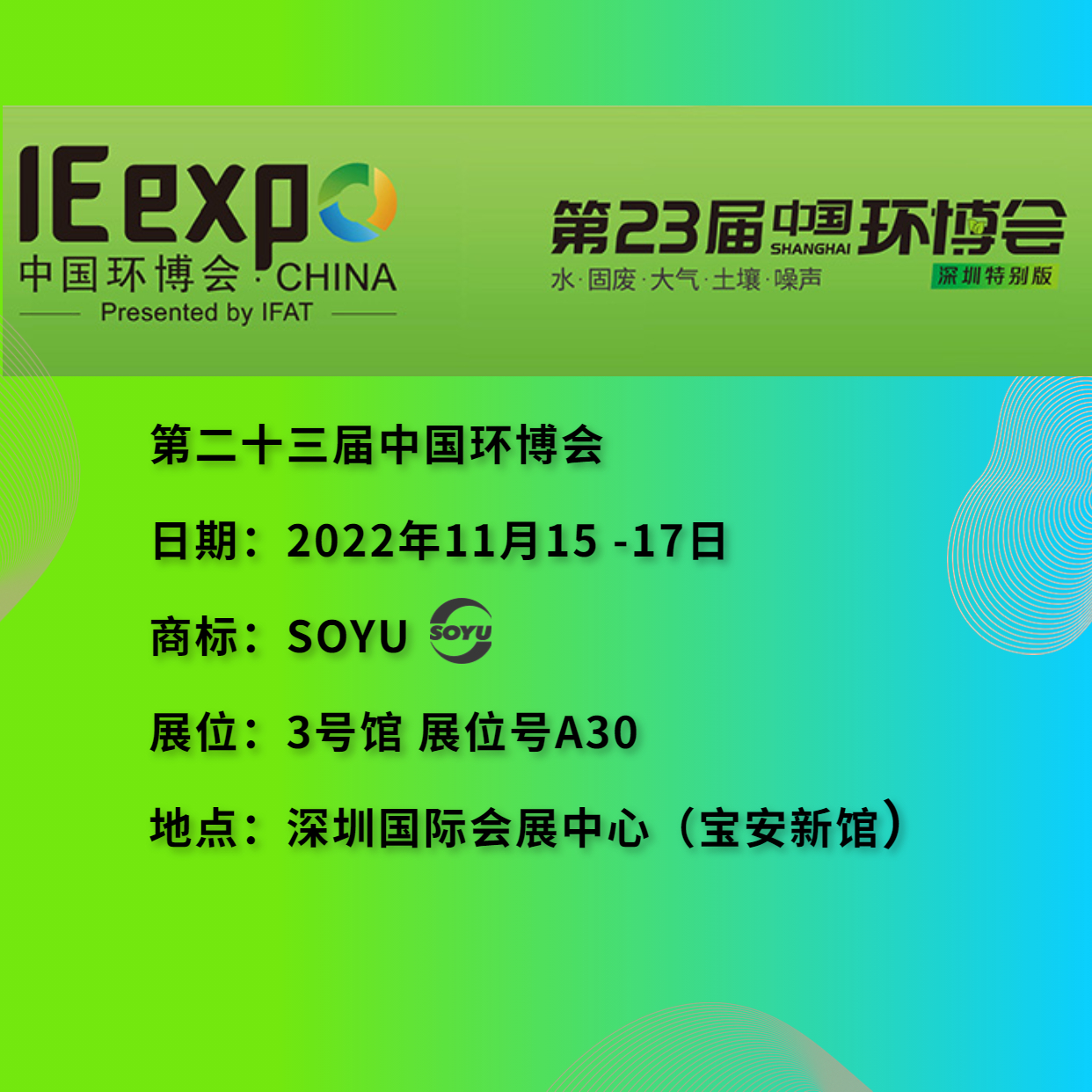 IE expo China 2022 第二十三届中国环博会 日期:2022年11月15 – 17日 参展单位:首誉(常熟)机械有限公司 商标:SOYU 展位:3号馆 展位号A30 地点:深圳国际会展中心(宝安新馆)